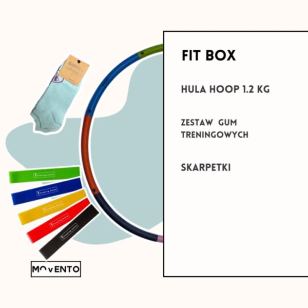 FIT BOX zawierający: HULA HOOP 1.2 kg 100 cm, Gumy treningowe MINIBANDS (5 sztuk), Skarpetki stopki kolor miętowy z logo hoopingmama.